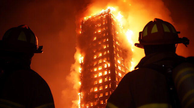 Firefighters confront a towering inferno in a city. Intense flames engulf a high-rise structure as emergency responders work diligently against the blazing fire.