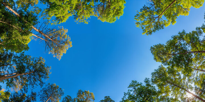 Majestic tall tree viewed from below with sunlight filtering through green canopy, forest perspective, copy space