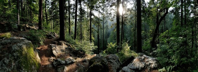 Forest canopy and nature's architecture: A dense forest scene showcases a myriad of towering trees reaching toward the sky.