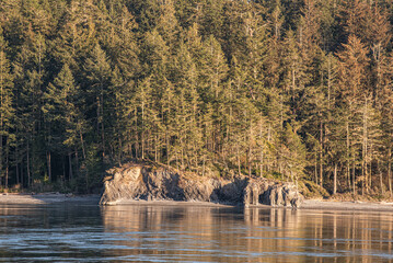 View of rugged cliffs meet the shimmering water, where a dense forest of towering trees frames the rocky outcrop in Oak Harbor, Washington, United States.