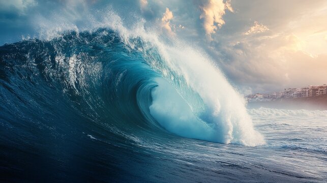A dramatic and image capturing a towering tsunami wave as it approaches the shoreline showcasing the immense power and destructive force of the ocean  The image conveys a sense of danger intensity