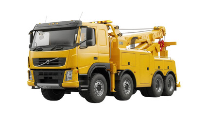 Yellow tow truck PNG isolated on transparent background, heavy duty vehicle for roadside assistance and recovery operations
