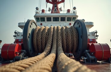Thick rope coiled on winch drum on cargo ship deck. Heavy duty equipment for mooring and towing operations. Part of maritime industry logistics.