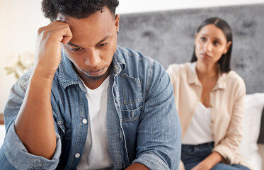 Angry, black couple and fight with stress at house of marriage conflict, bad communication and drama. People, thinking and relationship risk for divorce argument, cheating mistake and toxic betrayal