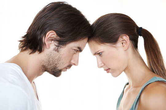 Couple, conflict and fight for marriage problems, head and argue or disagreement. Bad communication, divorce and argument for man and woman in studio, toxic and relationship and unhappy partnership