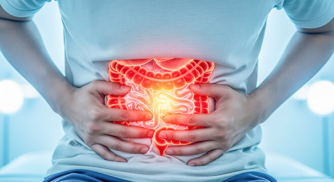 Person with severe stomach pain holding abdomen with glowing intestine hologram, concept of digestive system disease, food poisoning or intestinal inflammation, medical background.
