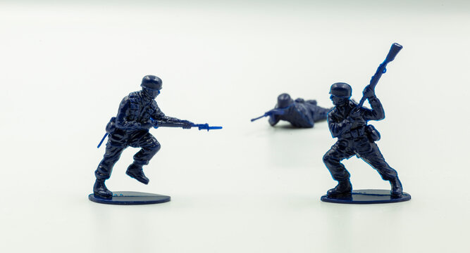 Close-up battle between two military toy soldiers against the white surface. Fighting soldier figure, plastic toys. two toy soldiers fighting against each other on a white background.