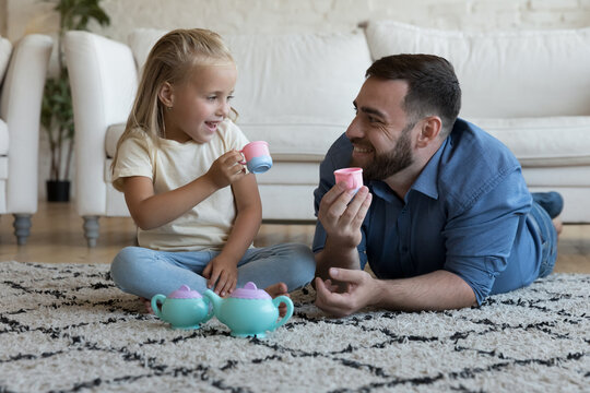 Happy dad and cute playful daughter kid relaxing on heating carpeted floor at home, playing drinking tea from small toy cups, talking, laughing, having fun, enjoying family playtime