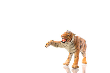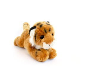 Plush stuffed toy tiger cub. Children's toy tiger with fluffy fur on a white background. Space for text