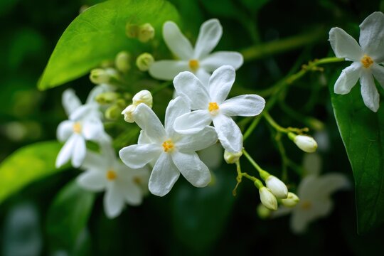 Selective focus of pure white fragrant flowers Star jasmine creeping on the wall, Trachelospermum jasminoides is a woody, Evergreen climber with rich, Greenery leaves pattern, Nature floral background