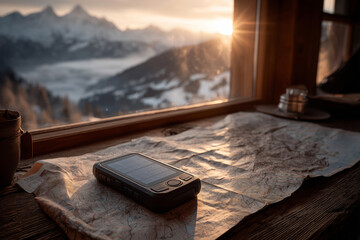 Solar-powered GPS trackers rest on a wooden table with a mountain view