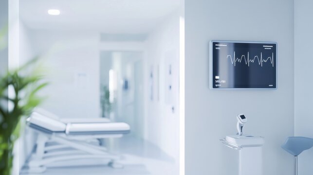 An advanced personal healthcare setup with a smart mirror displaying health metrics and a wearable device tracking fitness and wellness, Modern wellness theme, Clinical style