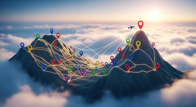 Mountain peaks with location markers and flight routes at sunrise with conceptual visualization.
