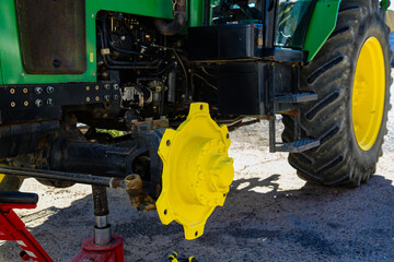 Rustic barn interior with tractor and various farming tools, showcasing a neatly organized workspace with wooden walls and ample natural light.
