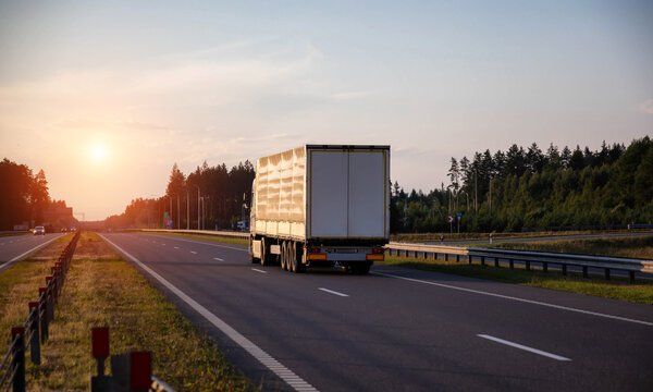 A truck with a tilt semi-trailer carries cargo along the highway in the evening against the backdrop of a summer sunset. The concept of cargo transportation, the logistics, the work and rest