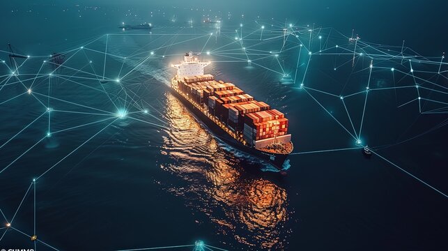 A container ship sails through calm nighttime waters, encircled by a glowing digital network, symbolizing the integration of advanced technology in global trade.