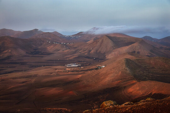 Sunrise in Lanzarote. Trade wind clouds coming over the mountains and dissolve. Canary Islands, Spain.