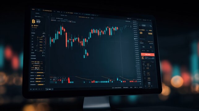 A stock trader analyzing digital candlestick chart, immersed in data and trends. screens display various financial metrics and graphs, reflecting dynamic trading environment.