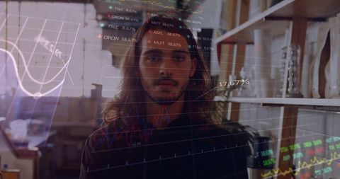 Bearded trader analyzing financial markets with candlestick charts and data dashboards