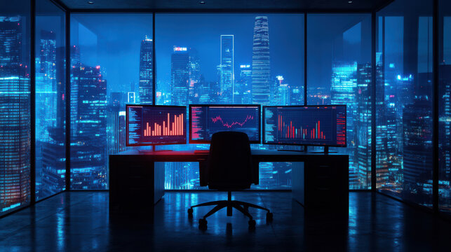 Night cityscape view from a modern trading desk with multiple monitors displaying stock charts. High-rise office setup overlooking illuminated urban skyline, emphasizing business, finance