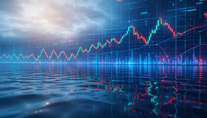 Dynamic stock market display over city skyline