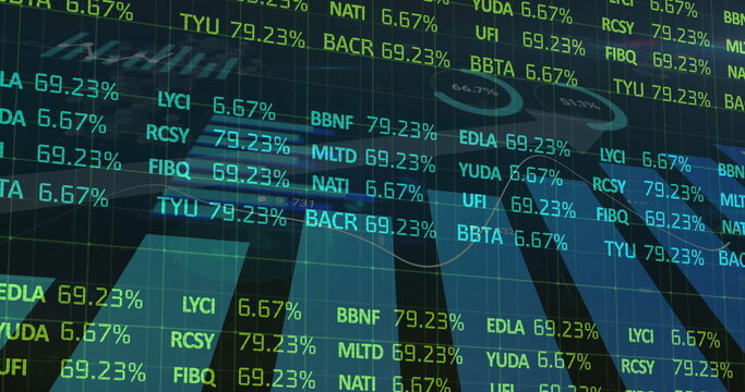 Displaying trading interface showing 3D bars, ticker symbols, percentages, gridlines, curves