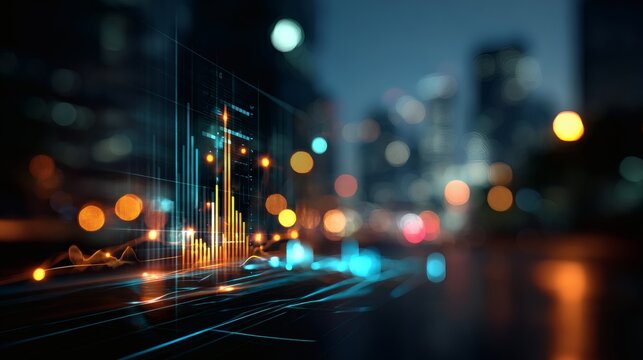 A futuristic interface displaying complex financial data with red and blue candlestick charts