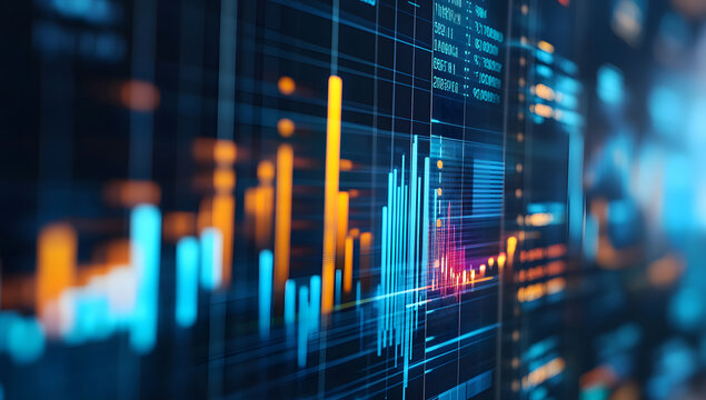 Digital trading dashboard showing rising bar chart and trend lines for investment analysis