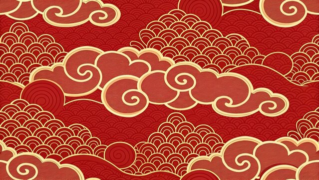 Luxurious golden embossed clouds with traditional Asian patterns on a vibrant red background, perfect for festive designs and celebrations