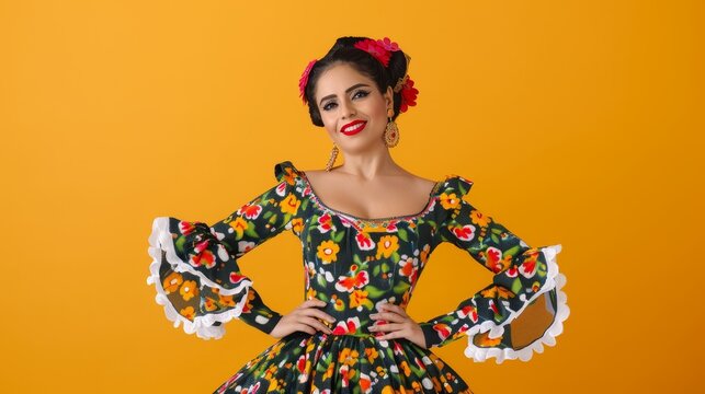 beautiful mexican woman in traditional floral dress smiling and posing against a vibrant yellow background