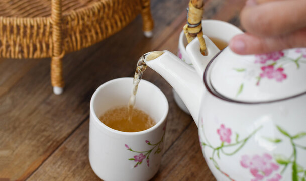 Hot tea being poured from a floral teapot into a matching cup on a wooden table. Warm beverage serving, Asian tea culture, relaxation, hospitality, traditional drink, and healthy lifestyle concept