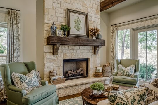 A timeless living room showcasing a traditional stone fireplace, oversized chairs, and subtle pops of sage green decor