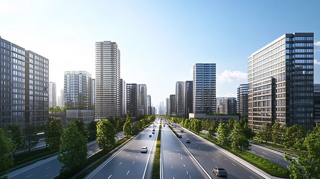 Modern metropolis with skyscrapers and highway traffic flowing on a sunny day