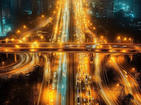 Aerial view of a busy urban highway at night with bright orange streetlights illuminating multiple lanes of moving vehicles and traffic flowing under an overpass surrounded by tall buildings