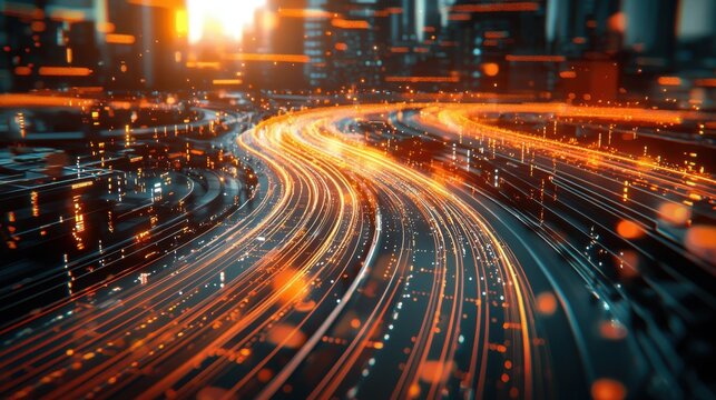 An aerial view of a futuristic city with vibrant light trails from cars on a high-speed road, showcasing the speed and connectivity of modern technology