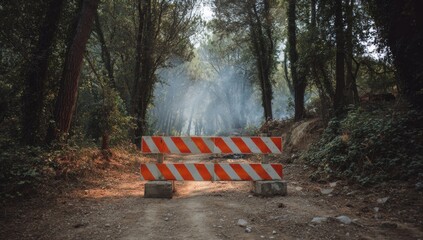 Barricade Blocking Forest Path with Ethereal Light and Smoke