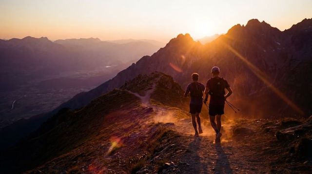 Backlit trail running duo hiking narrow alpine ridge at golden hour sunset
