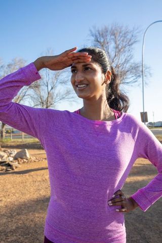 Sunlit asian woman running uphill on coastal cliff road during golden hour for fitness motivation