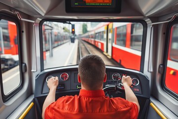 Train operator in red uniform driving