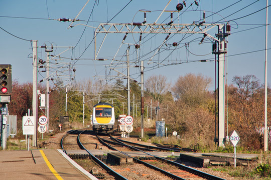 Railroad switch with train in the morning sun. The conception of  change or choices or decide.