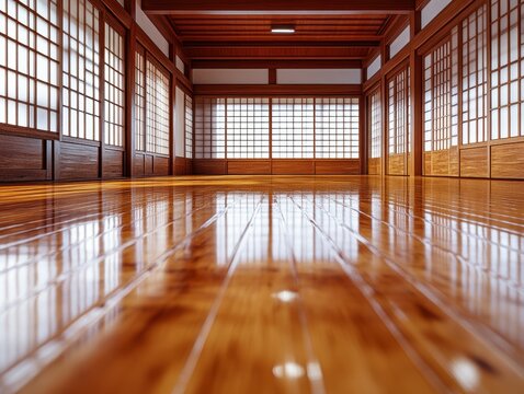 Kendo Practice Space Dojo Detailed Shot Polished Wood Environment Ground Level View Tranquil Atmosphere