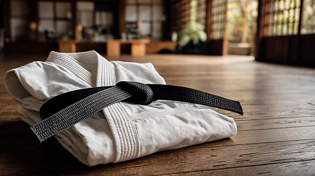 Neatly folded karate uniform with a black belt rests on a polished wooden floor, showcasing traditional martial arts attire in a serene dojo environment