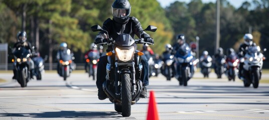 Motorcycle Training Session with Instructor Demonstrating Techniques in a Driving School Lot