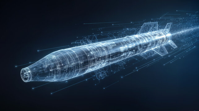 Futuristic 3D Wireframe Hologram of a Missile Amidst Digital Connections on Dark Blue Background for Tech and Defense Concepts