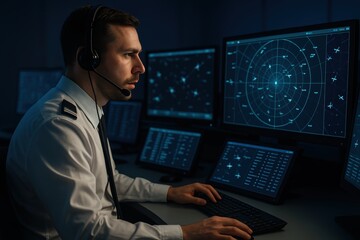 Vigilant Controller in the Cockpit: A focused air traffic controller meticulously monitors radar screens, embodying precision and expertise in a high-stakes environment.