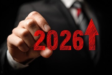 A hand draws "2026" with an upward arrow, suggesting growth or progression
