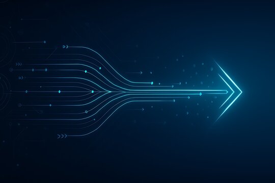 Multiple glowing data streams merging into single bright arrow, concept of alignment, strategy and focused business direction