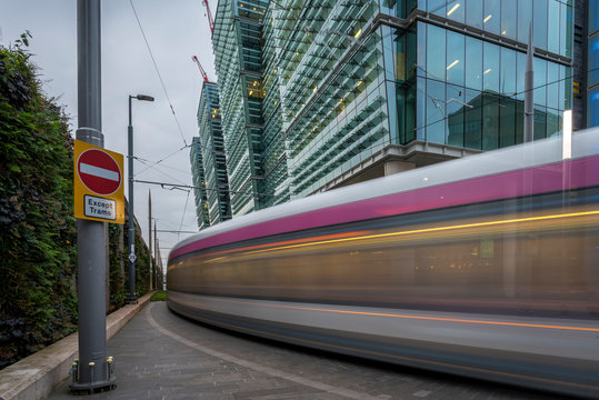 Modern light rail tram in urban street scene.  A sleek, light gray tram moves through a city street lined with shops, pedestrians, and mature trees.  The tram's design is modern and efficient
