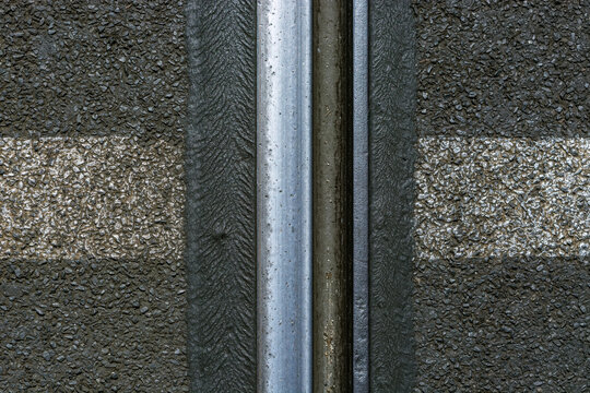 Fragment of a steel rail of a tram track on a background of gray asphalt.