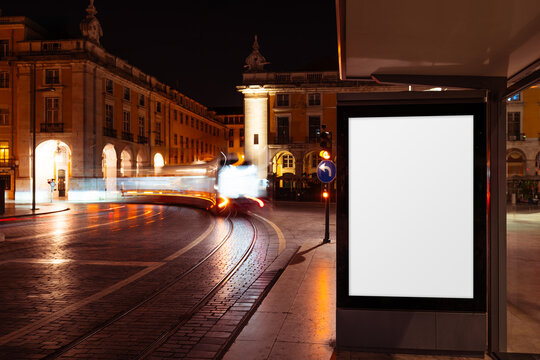 Blank vertical billboard mock-up at a bus stop in Lisbon at night, illuminated by warm city lights and blurred tram motion on wet cobblestone tracks, perfect for urban advertising design